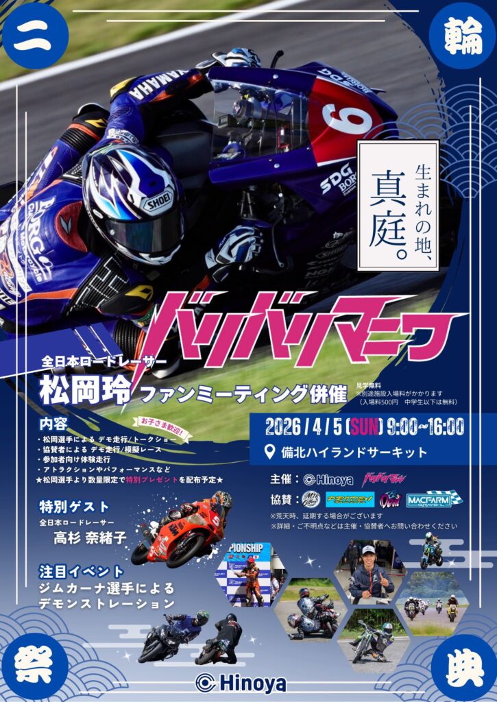 真庭市出身の全日本ライダー松岡玲のトークショーや数量限定プレゼント企画、デモ走行など予定しています。